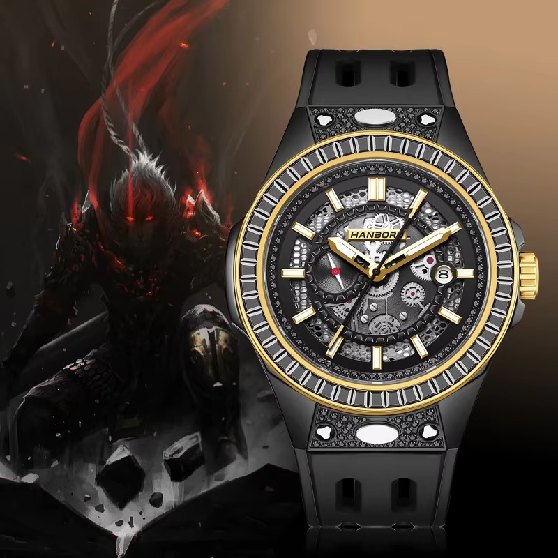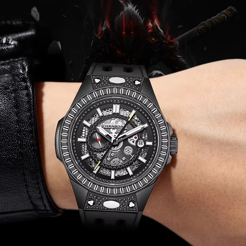Layered skeleton dial with a faceted bezel and micro-pave accents adds depth. Black-coated steel case, breathable rubber strap, and a practical date window complete the sporty-luxe look.